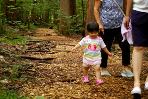![]() 柔らかいチップの敷き詰められた道を歩くが、木の根に足を乗せるとつるっと滑ります。 |