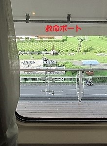 ![]() 船室7095はKステーと呼ばれ、オーシャンビューではあるが、窓からの眺めは救命ボートで景色がさえぎられる。 |