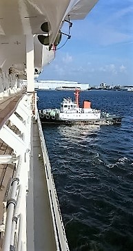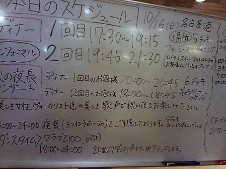 ![]() 地下鉄で東山線>栄>名古屋港へケースを引いて1時間>14:15〜15:00受付ポートビル(遅刻は乗船拒否!) |