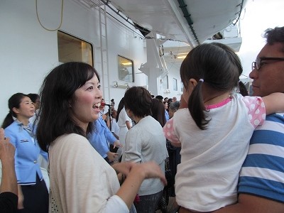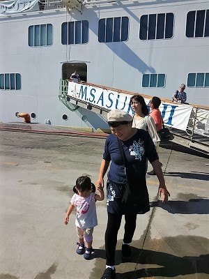 ![]() 5デッキに降りて下船(ICチップ入りカードで管理) ゆるキャラ『おりょうさん』に気味悪がる孫! |