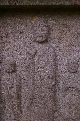 ![]() Am9:00 正歴寺参道で南大門跡に建つ『泣き笑い地蔵』 左)身替地蔵菩薩(笑い地蔵)は、享禄四年(1531)の銘がある船型光背 右)水子地蔵(泣き地蔵)は円光光背 |