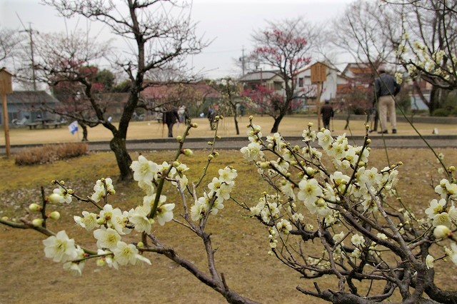 ![]() 梅園では楽しそうに、グランドゴルフに興じる元気なご老人達! |