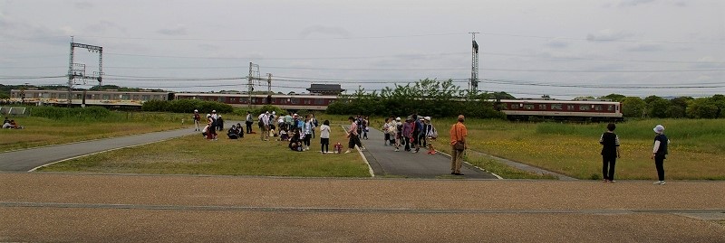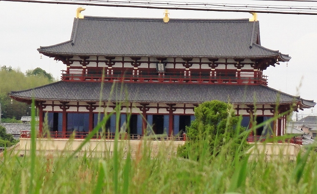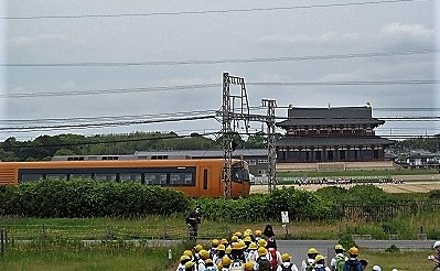 ![]() 朱雀門の真北約800mに堂々とそびえる「大極殿」が小さく見えます。 平常宮跡を横切る近鉄奈良線! 少し遠いので昼食に戻り車で近くまで行くことにしました。 |