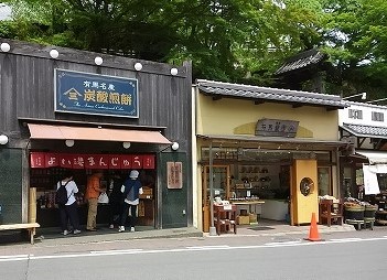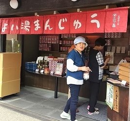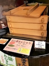 ![]() 蒸したての饅頭を食べ温泉街を車で散策して奈良に向かう |
