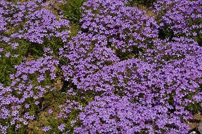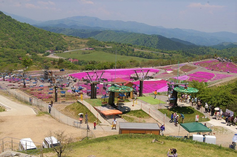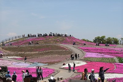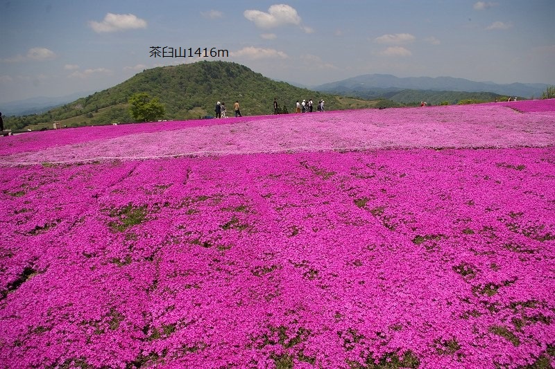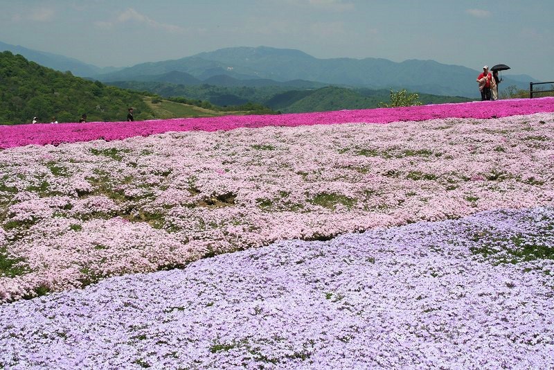 ![]() 萩太郎山1358mの頂上付近に広がる色鮮やかな芝桜の絨毯。 |