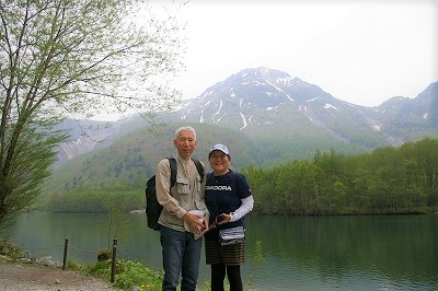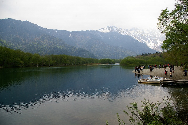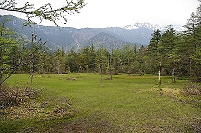 ![]() 大正池と雪を被った岳沢が見えてきた 焼岳を背に |