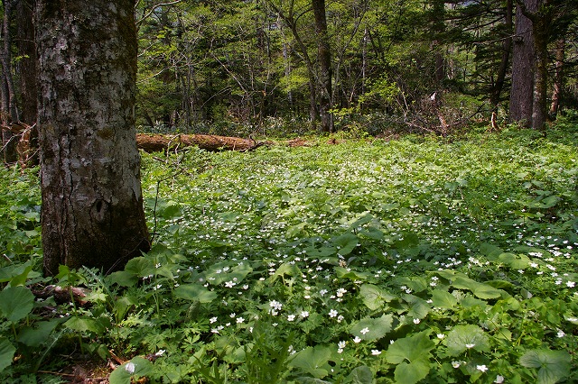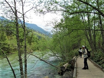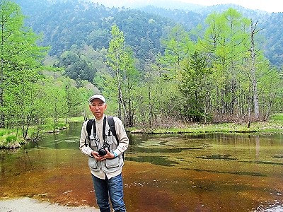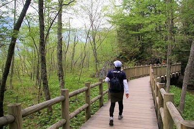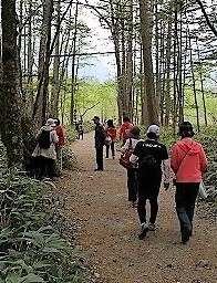 ![]() 12:00〜昼食を食べ明神池に向かいます。 12:25 行きは湿原のある左から(上流に向かい) |