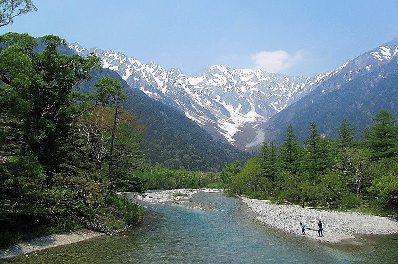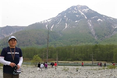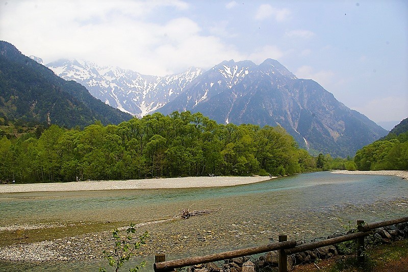 ![]() 橋上から望む穂高連峰や焼岳、梓川の水面! ライブカメラに映り、電話? |