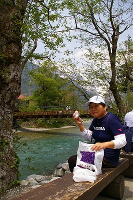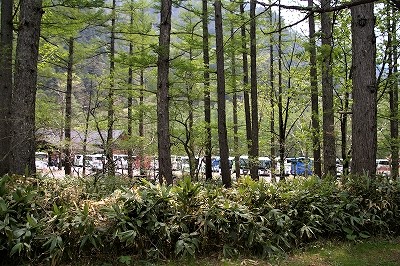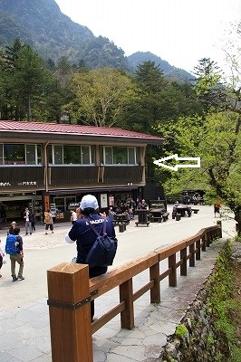 ![]() 観光バスが並んでいます 河童橋が見えてきました |