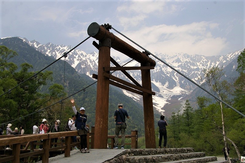 ![]() 上高地の中心にあってシンボル的存在 『河童橋』 ライブカメラに向かい手を振る |