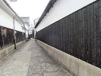 ![]() 倉敷の路地に焼板塀が続く 観光を終えたら雨が降り出した。 |