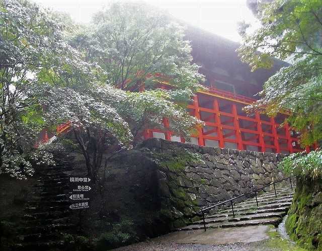 ![]() 『横川中堂』 本堂の横川中堂を中心とする区域。 本堂は遣唐使船がモデルで、浮かんで見える舞台造り! |