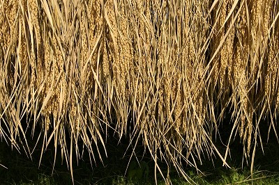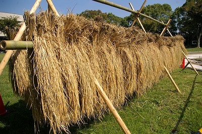 ![]() 園内に刈り取った稲をハザに架けた天日干しが見られました |