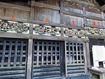 ![]() 神厩舎・三猿(しんきゅうしゃ・さんざる)【重文】 ご神馬をつなぐ厩(うまや)です。昔から猿が馬を守るとされているところから、長押上には猿の彫刻が8面あり、