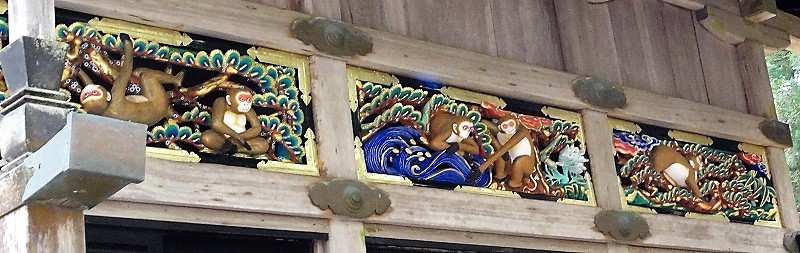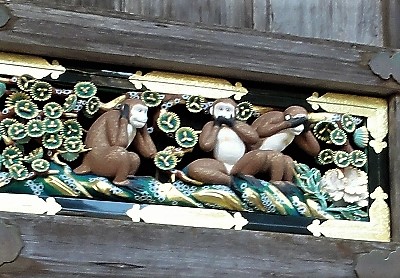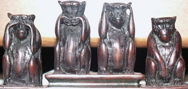 ![]() 本当は?一番右端の股間を両手で覆っている猿(浮気はしない)が「四猿」です。 論語の『礼に背くものは見ない、聞かない、言わない、しない』が中国の文化思想 |