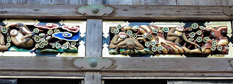 人間の一生が風刺されています。 中でも「見ざる・言わざる・聞かざる」の三猿の彫刻が有名です。 A幼少期に、悪いことは見ない、聞かない、言わない。