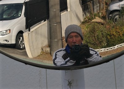 ![]() カーブミラーで記念写真 |