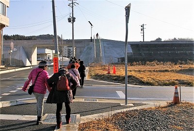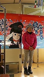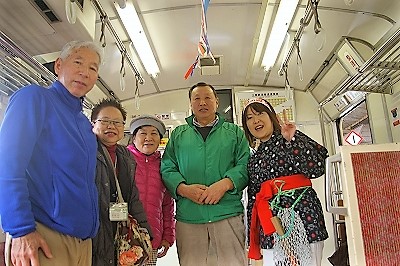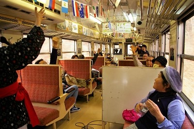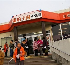 ![]() クイズやじゃんけんで盛り上がる>久慈駅に到着(久慈観光案内人の方と) |