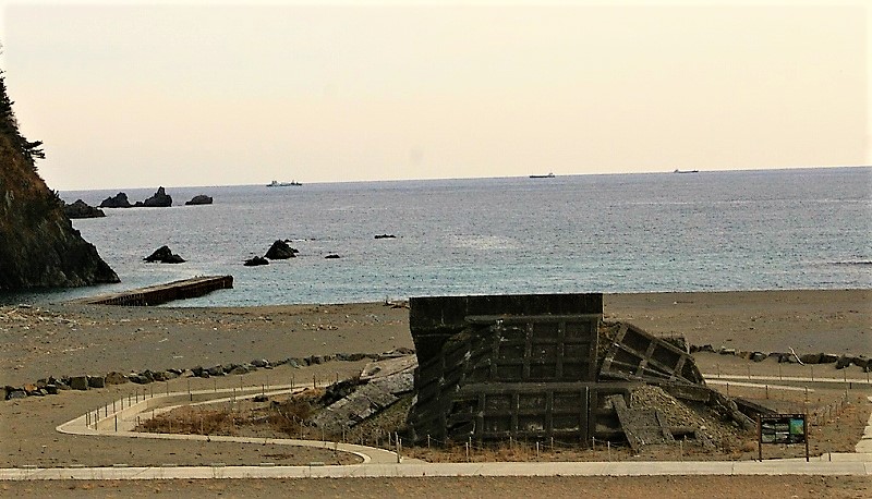 ![]() 高さ10mの防波堤の崩壊。東日本大震災の津波水位は17.3mでした。 新しく造られた防波堤を見学! 『道駅たろう』 道駅では震災に協力のポロシャツ\2500を購入! |