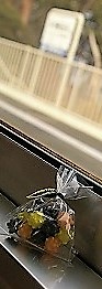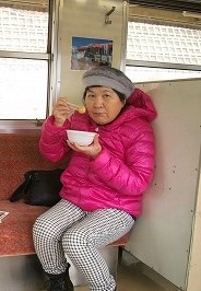 ![]() 海女ちゃん列車に乗り込むと「まめぶ汁」旧山形村の郷土食(クルミ入りの 団子)が出てきた。 |