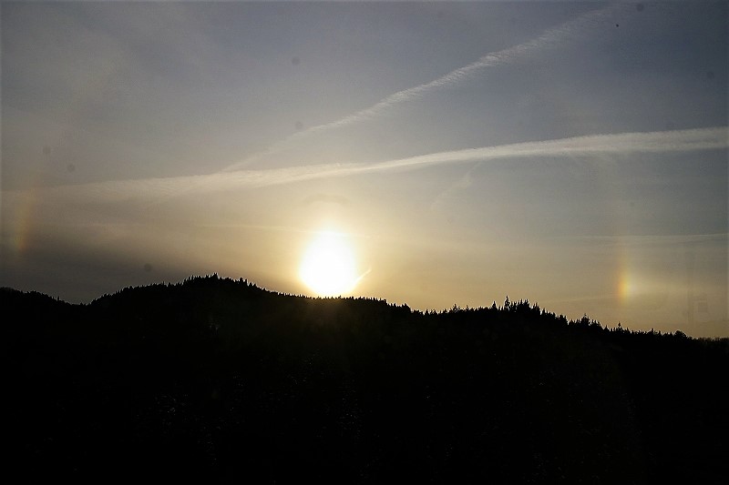 ![]() バスの中から幻日(太陽の両側に1個ずつ見える太陽のような像)を見ることができました 虹色に輝く大気光学現象(大気中の氷の粒で光が屈折して起こる) |