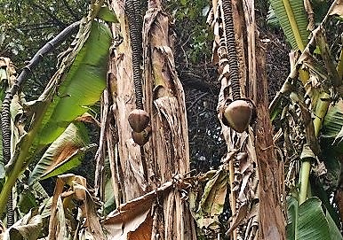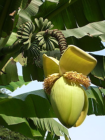 境内に ![]() バナナ状の小さい実を つける芭蕉の花。 葉っぱの繊維から 「芭蕉布」を作る。 幹の中の繊維から 「芭蕉糸」を作る。 |