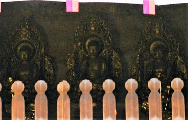 ![]() 舎利殿の三世仏(運慶作・左から阿弥陀現在・釈迦過去・弥勒未来)の永遠の平和を願う! |