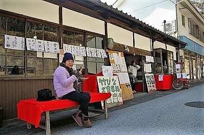 ![]() TVにも出た竹びなの飾りがあるお食事処で団子を食べる |