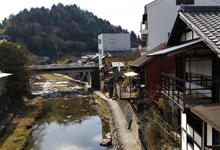 ![]() 足助小橋から足助橋の奥には飯盛山を仰ぐ |