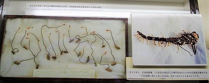 ![]() 左)カメムシタケ(カメムシに寄生) 右) ヤンマタケ(オニヤンマに寄生) 冬虫夏草というと、厳密には、コウモリ蛾に寄生するただ一種の菌類を指す。 |
