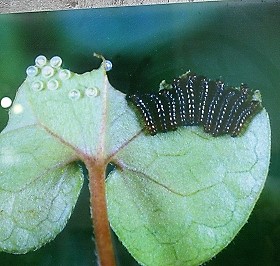 ![]() 幼虫の食草はカンアオイと呼ばれる植物の仲間で、葉の形はカラーや里芋の葉によく似ている。 |