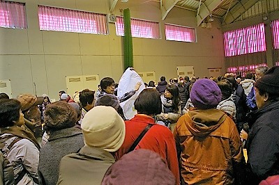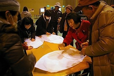 ![]() 先ずは体育館でランタンの書き方の説明を受け、思い思いの願いを書く。 |