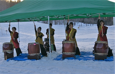 ![]() 女性だけの和太鼓が始まる。 正面に回ると音が腹に響き迫力が増します |