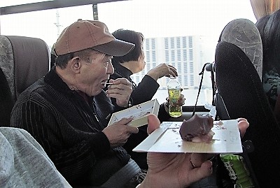 ![]() 10:15 朝食が少なかったと赤福を食べています 11:20 恵那SAでお昼の弁当を受け取り昼食 |