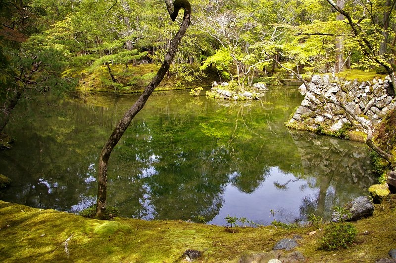 ![]() 上段の枯山水式庭園(指東庵しとうあん横の庭園) 夢窓國師作庭の西芳寺枯山水はあらゆる枯山水庭園の原点ともなり、枯山水庭園の最高峰とも評されています。 |