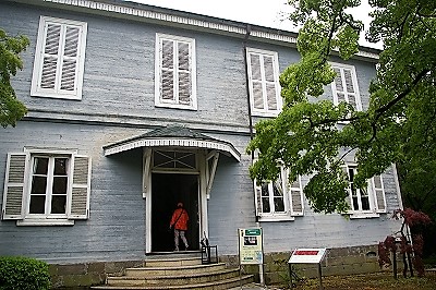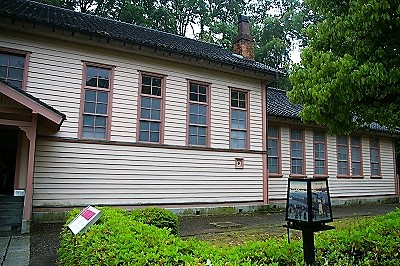 ![]() 左『近衛局本部付属舎』での明治村住民登録(年間パス\2500)にやってきた。 右)師範学校 |