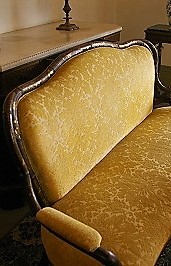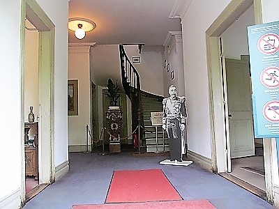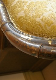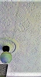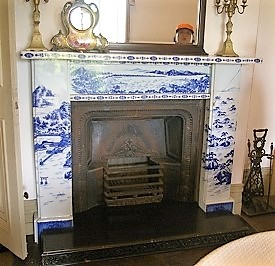 ![]() 天井に張られた押し出し模様の鉄板 暖炉は日本三景を焼き付けた瀬戸焼 定刻に建物の案内をしてもらえば、いろいろな部屋の説明をしてくれます。 |