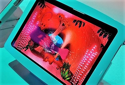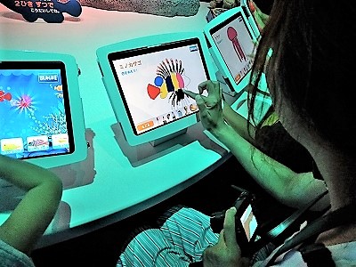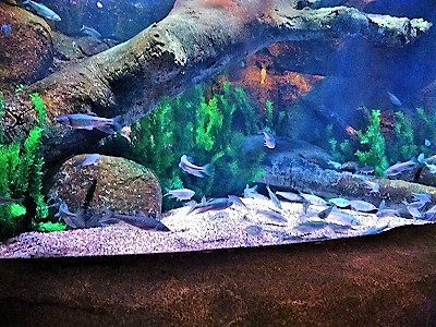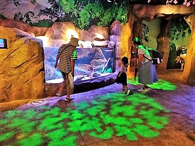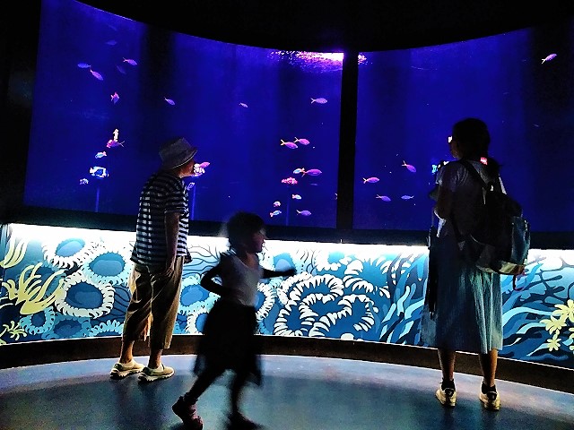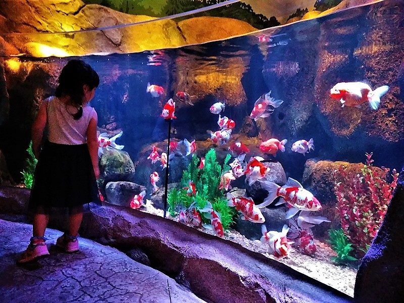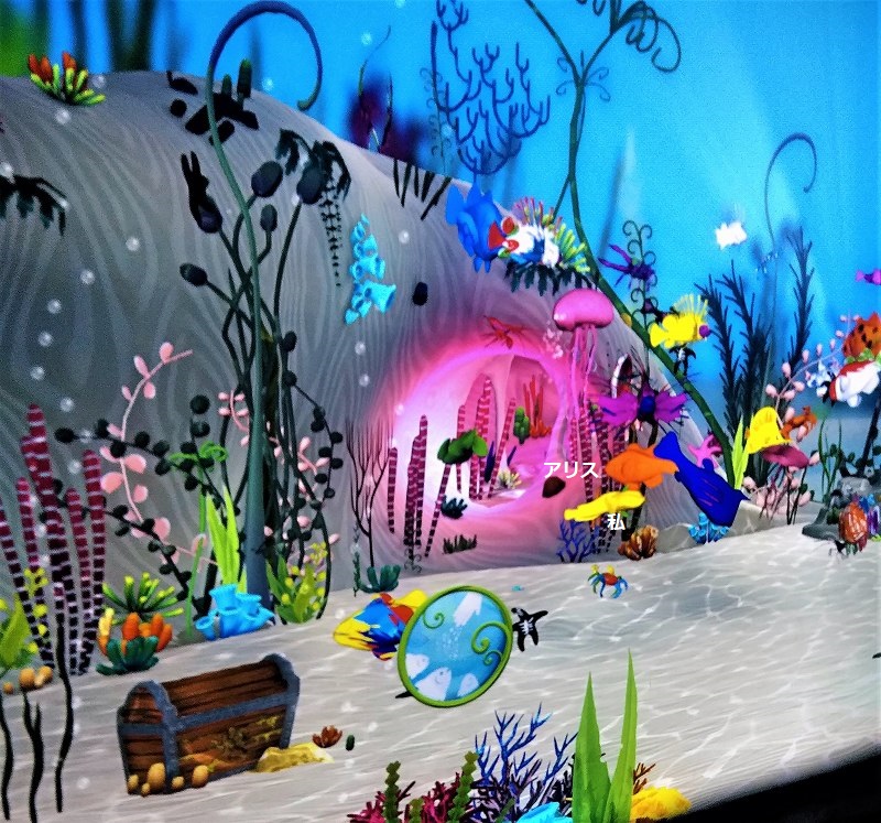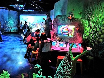 ![]() 自分のオリジナルの魚が大水族館で泳ぎ始める(右の画面で泳ぎ奥に消えると) |