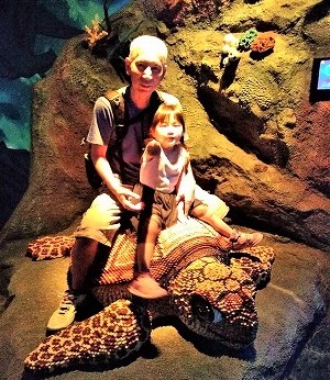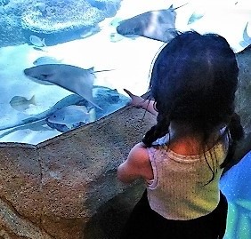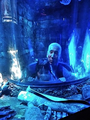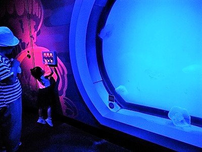 ![]() クラゲの水槽の灯りを捜査中! タツノオトシゴを拡大鏡で見る3歳児 |
