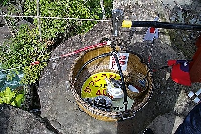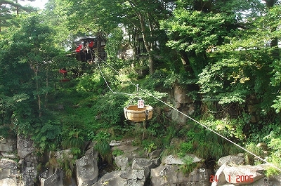 ![]() 渓谷の上空をカゴに入ったかっこう(郭公)団子(3本\400)が、ワイヤーにつながれ飛んでいる。 |
