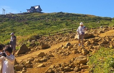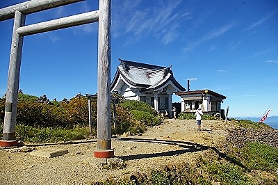 ![]() 結構急こう配の階段を登ると苅田岳山頂奥之宮 ツアー客でここまで来たのは4人だけ |