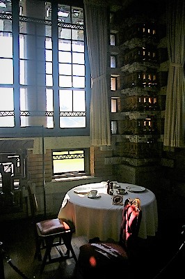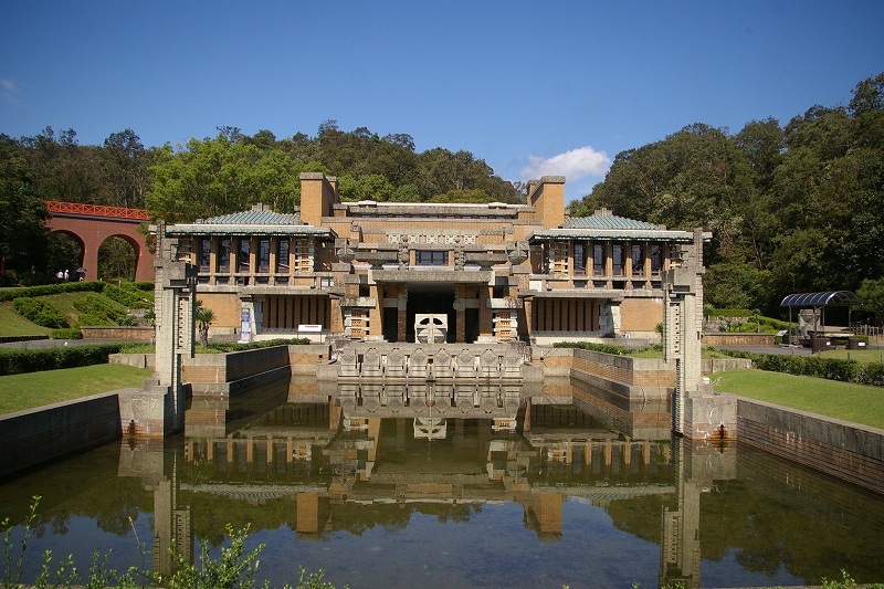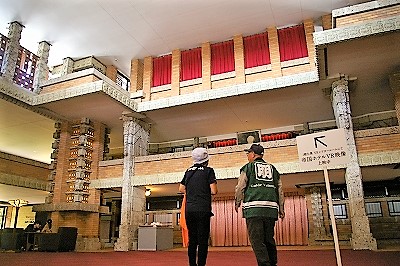 ![]() 『帝国ホテル中央玄関』 20世紀建築界の巨匠、アメリカの建築家フランク・ロイド・ライトによって設計され、大正12年(1923)4年間の大工事の後に完成。 |