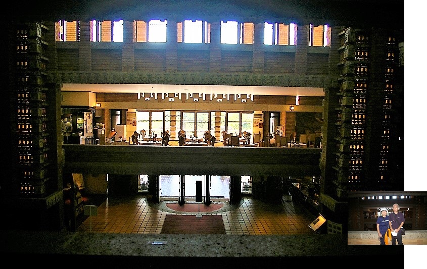 ![]() 吹き抜かれた大空間の中を光が上下左右に錯綜し、廻りの彫刻に微妙な陰影を与え、ロビーの雰囲気を盛りあげている。 |