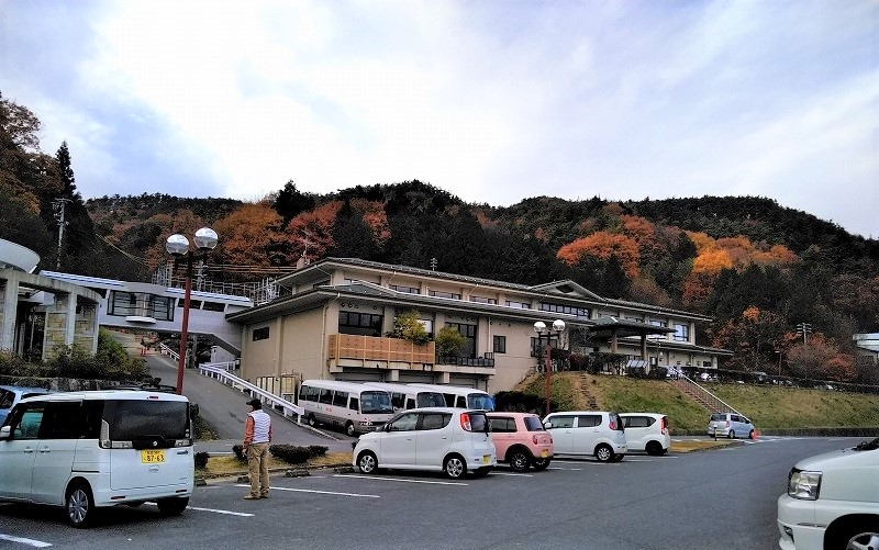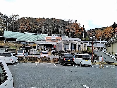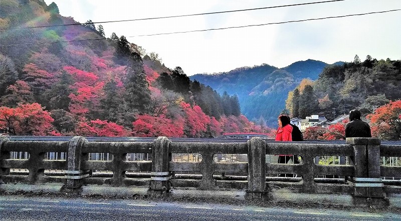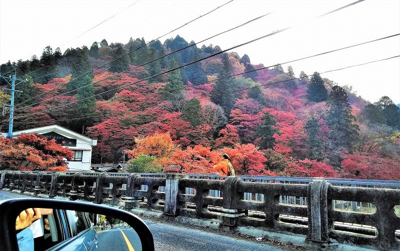 ![]() 香嵐渓は終わりがけ(車が来ないので橋の上に止まって) |