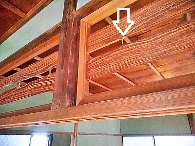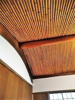 欄間に使われた竹(縦に三等分して真ん中だけ使い竹の形に杉板を削る技術) 浴室の天井は船底張り |