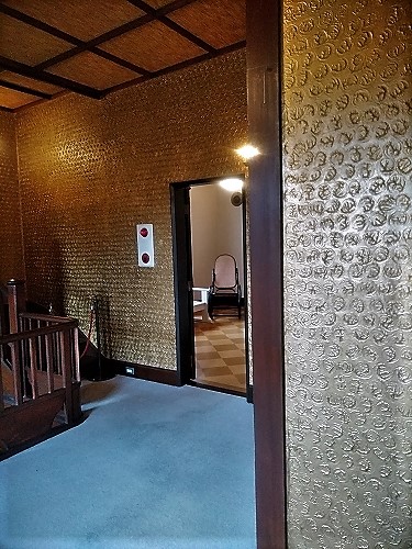 ![]() 左)階段を支える鉄柱は本来ありません(移築後、補強のため取り付け)ので、柱がなくても良い設計です。 説明ガイドを受けて 右)壁の模様は型を作り一つづつ押して制作 |