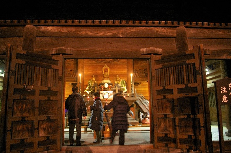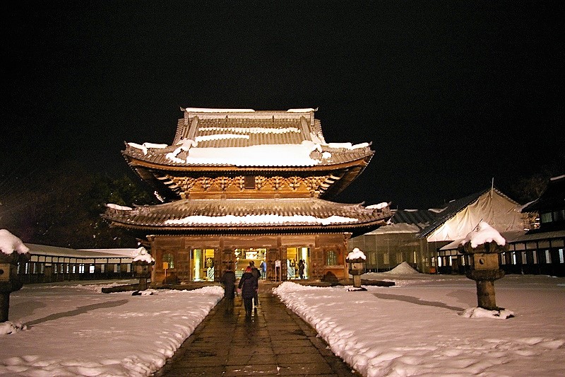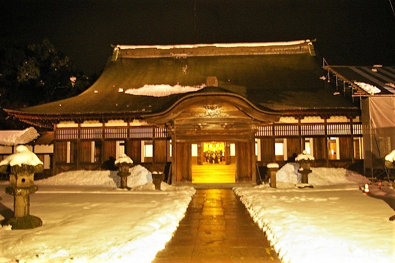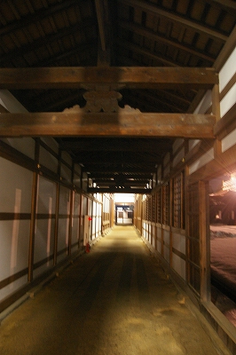 ![]() 回廊から見た仏殿 2018年も終わろうとしています 規則的に並ぶ障子と白壁の白さ、そして雪の白さが闇の深さに照らし出されていました。 |