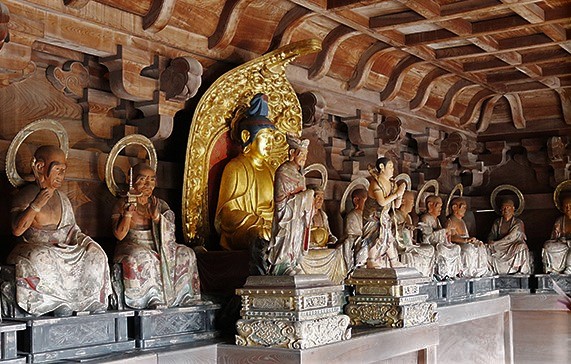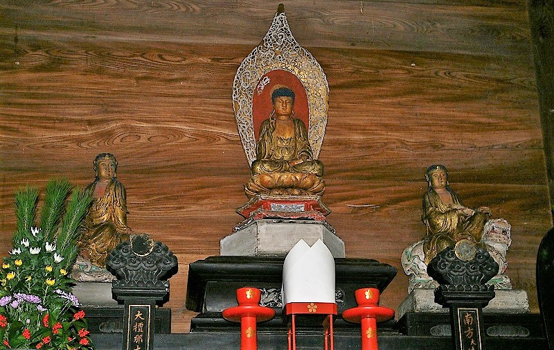 ![]() 須弥壇には中央に釈迦如来、脇侍に文殊、普賢菩薩の釈迦三尊を祀る。 |