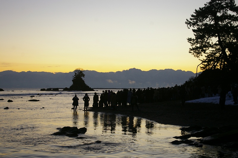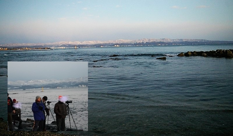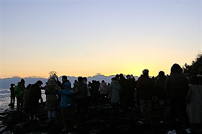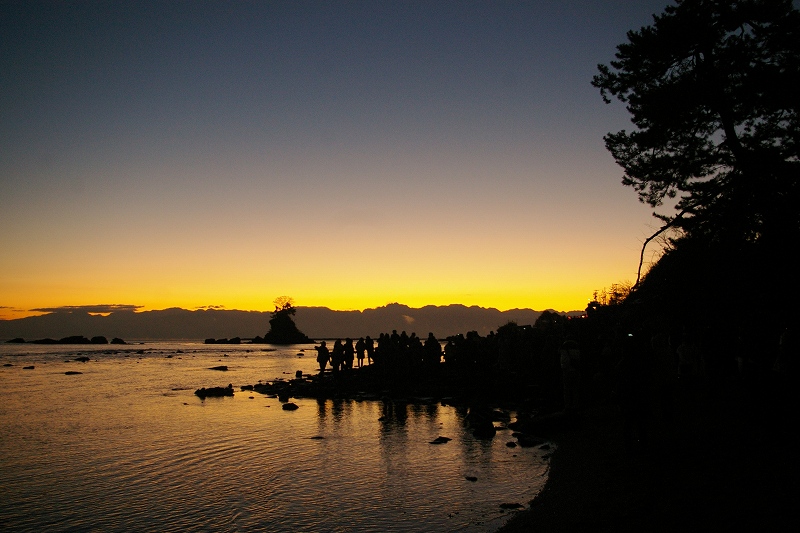 ![]() 7:05頃の日の出を待つ観光客でいっぱい! 慣れたカメラマンは磯の中 |