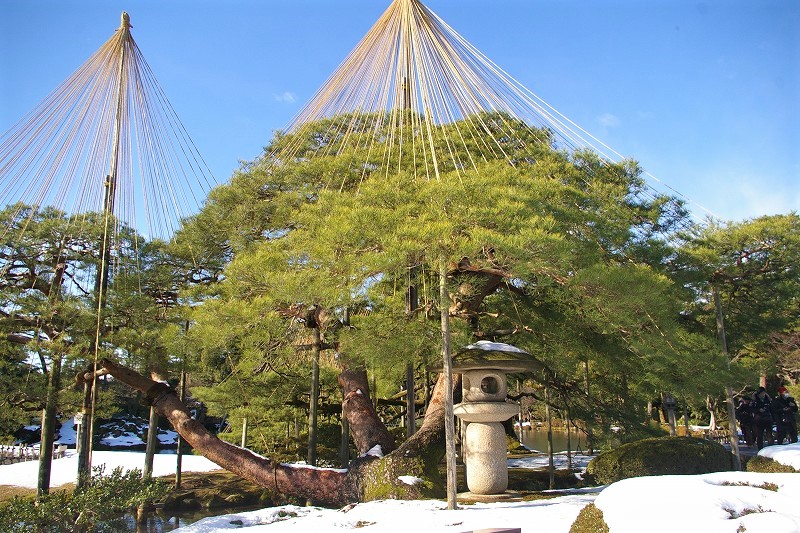 ![]() 『唐崎松』琵琶湖畔の唐崎から種子を取り寄せて育てた黒松。 園内一の枝ぶりで、冬の名物「雪吊り」は11月にこの松から作業を開始する。 |